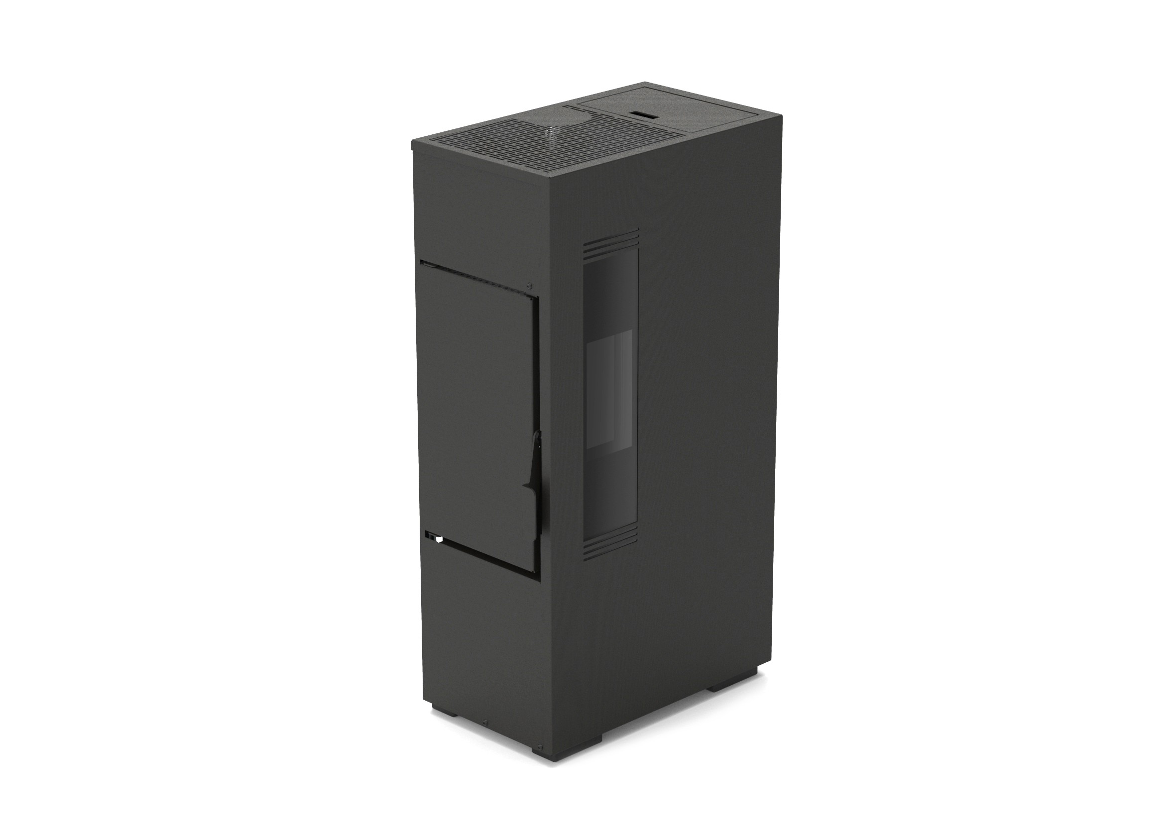 Jak wszystkie nasze piecyki jest ładowany od góry. Komora spalania jest zaś wyjątkowo tak skonstruowana, że drzwiczki do paleniska są na lewym boku pieca.  Na prawym boku jest umieszczony wyświetlacz z programatorem.